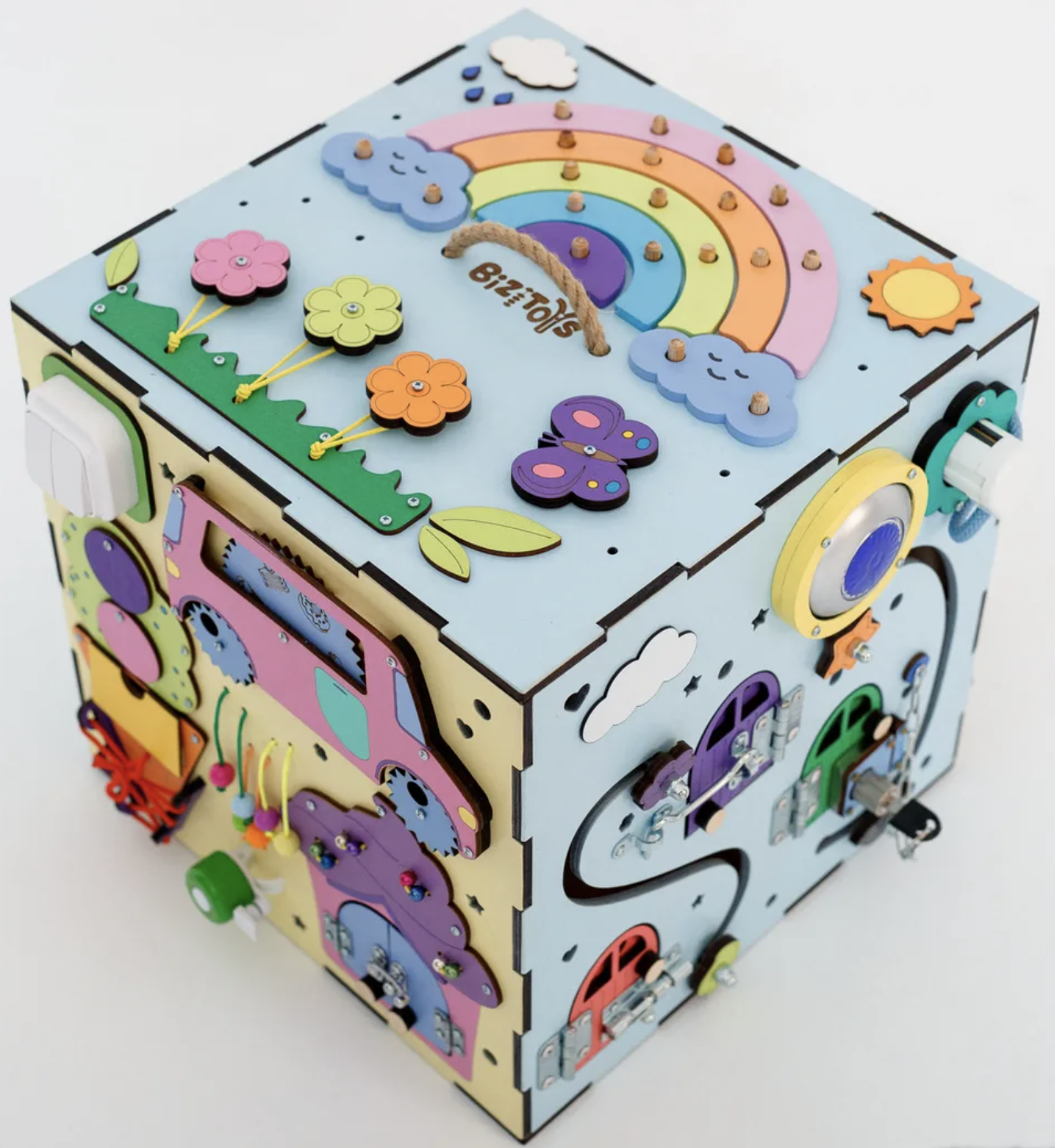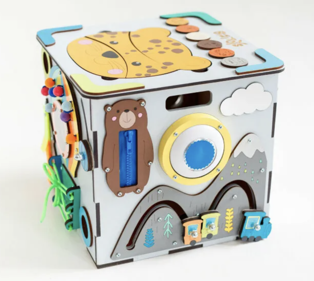 - Разнообразие элементов: Важно, чтобы в бизибоксе было множество разнообразных элементов для изучения, чтобы он не наскучил ребёнку быстро.